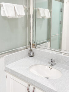地板磁磚的縫隙、洗手台、蓮蓬頭的每個角落,完全沒有一點水垢,打掃得非常完美又乾爽的浴室。